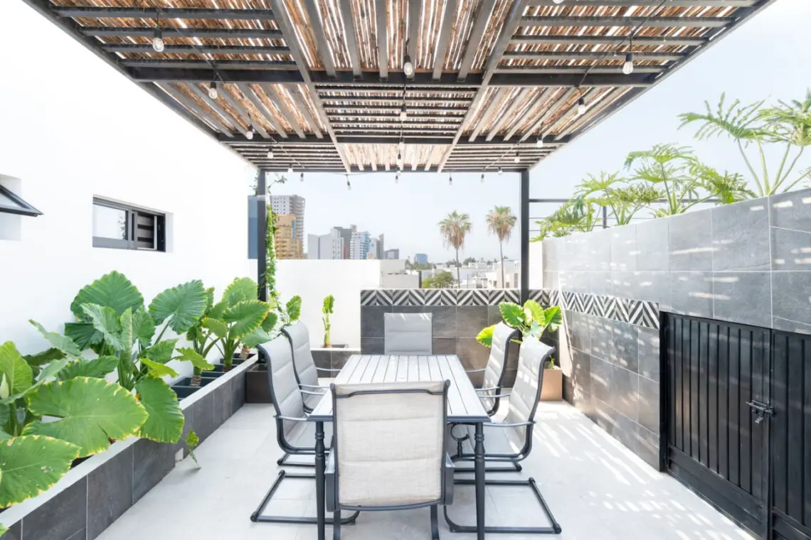 Una terraza muy cómoda y agradable con área de piscina y asador.