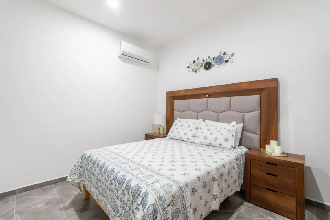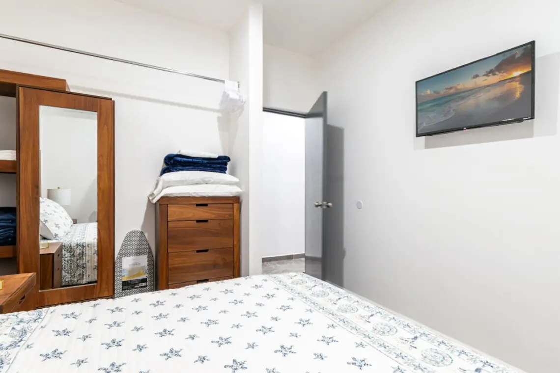 Y su habitación con su cama queen y espacio de closet.