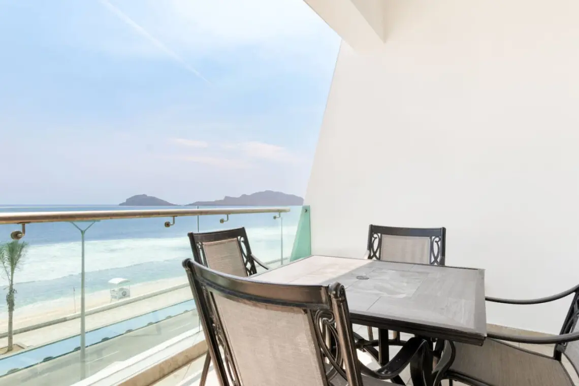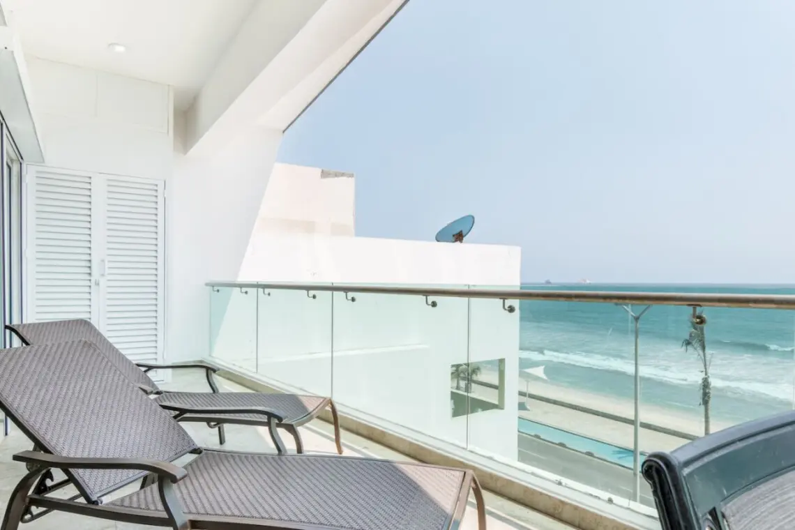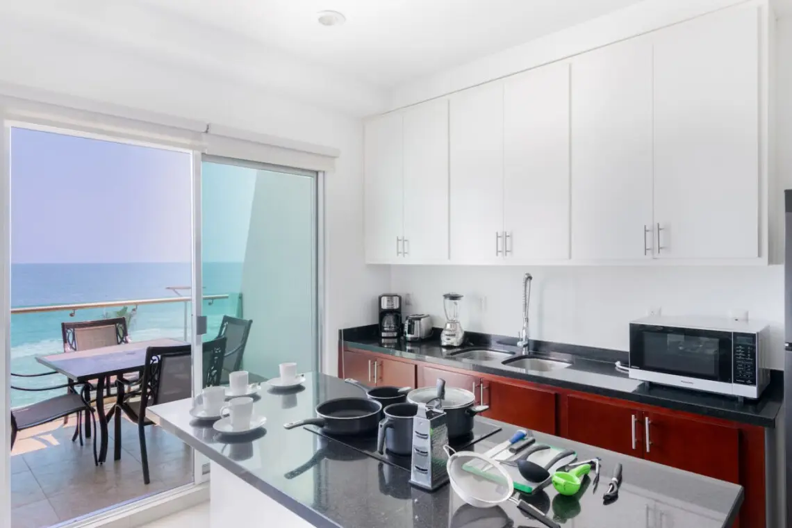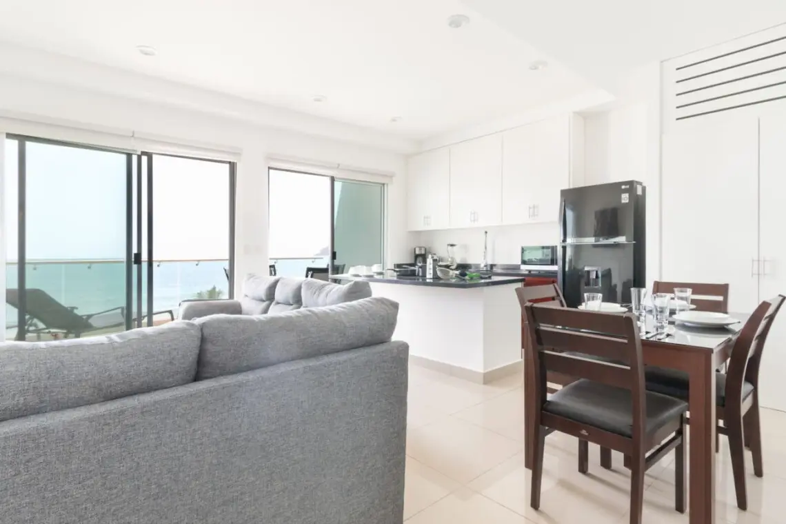 Relájate en el balcón privado con vista al océano y disfruta de cocina totalmente equipada, Smart TVs en cada recámara, lavadora y secadora, aire acondicionado minisplit y estacionamiento privado.
