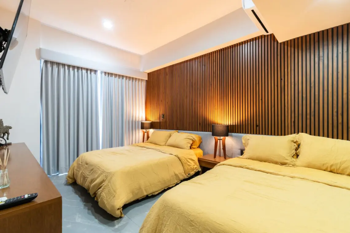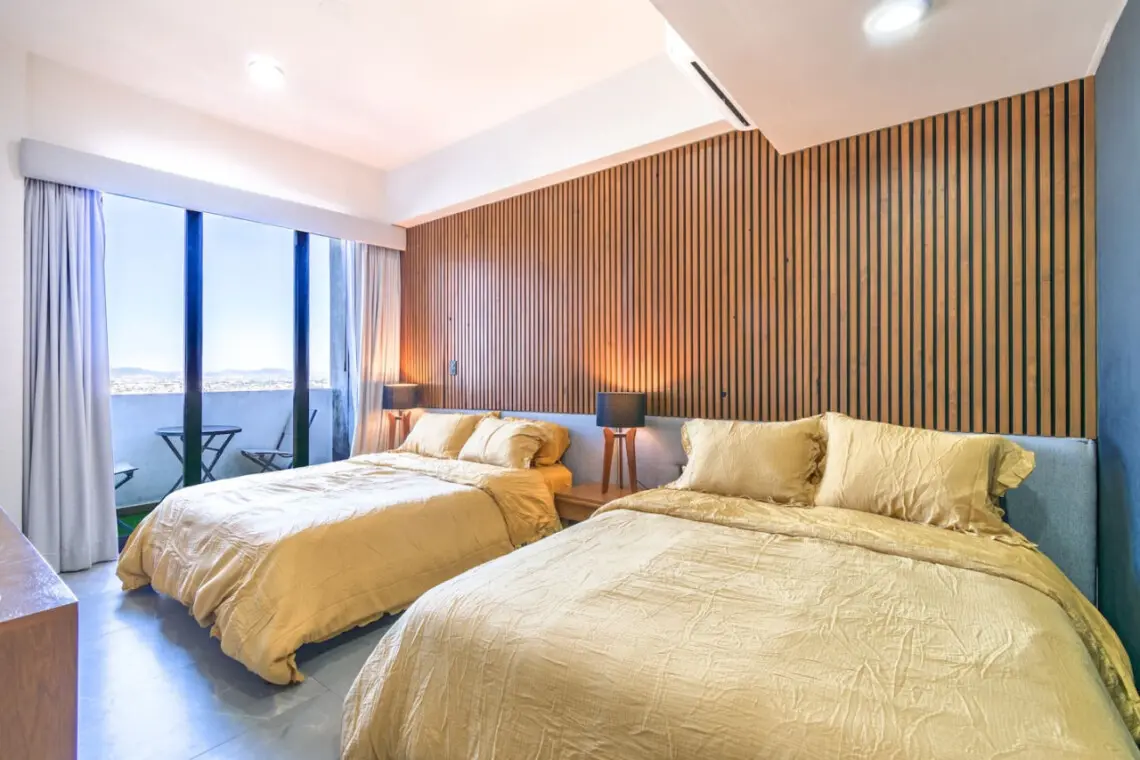 El departamento está en el piso 14, cuenta con dos habitaciones. la primera con dos camas queen, un baño y closet privado y un balcón.