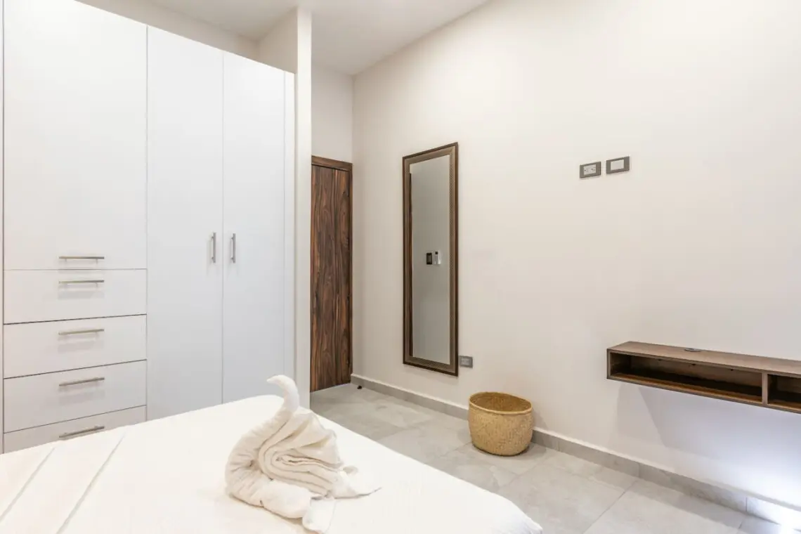 El espacio cuenta con dos habitaciones bien iluminadas y equipadas, la principal con cama King y televisión, mientras que la segunda habitación tiene cama Queen y baño privado.