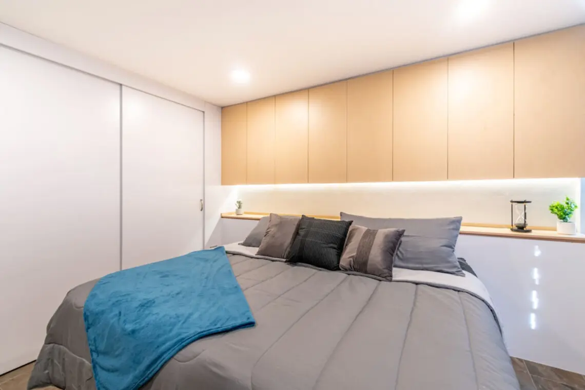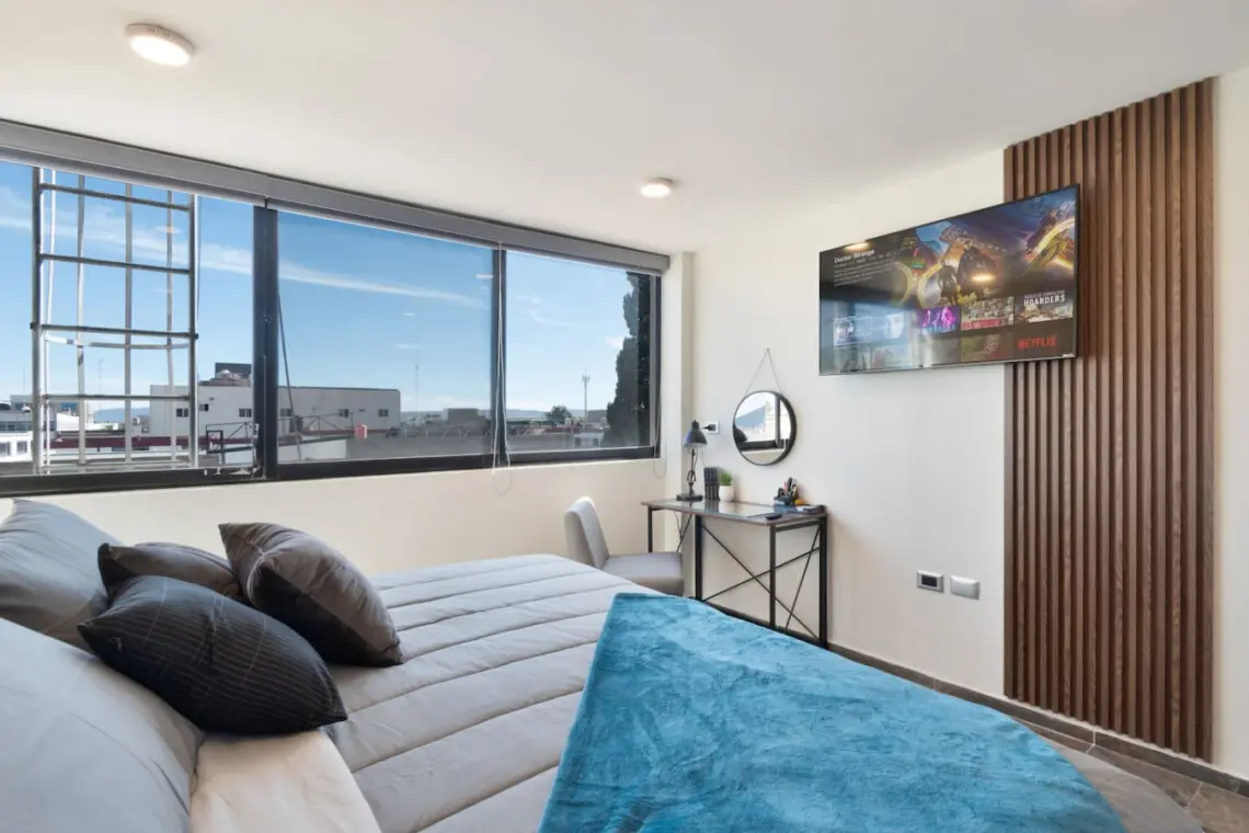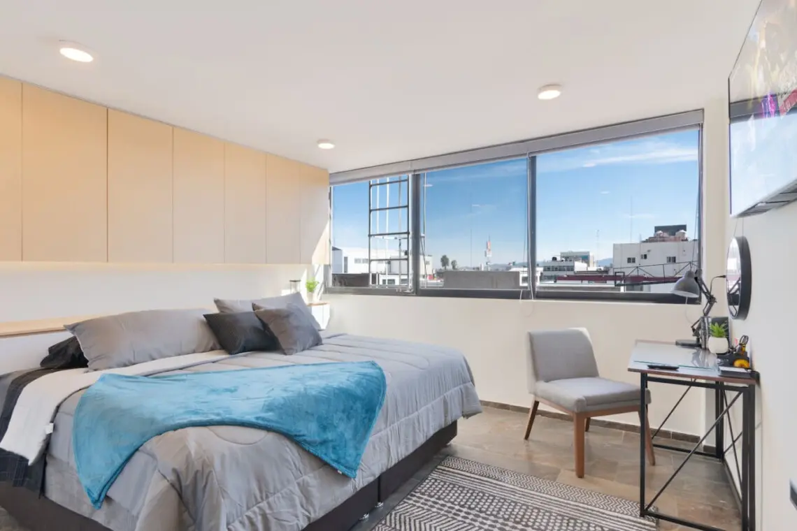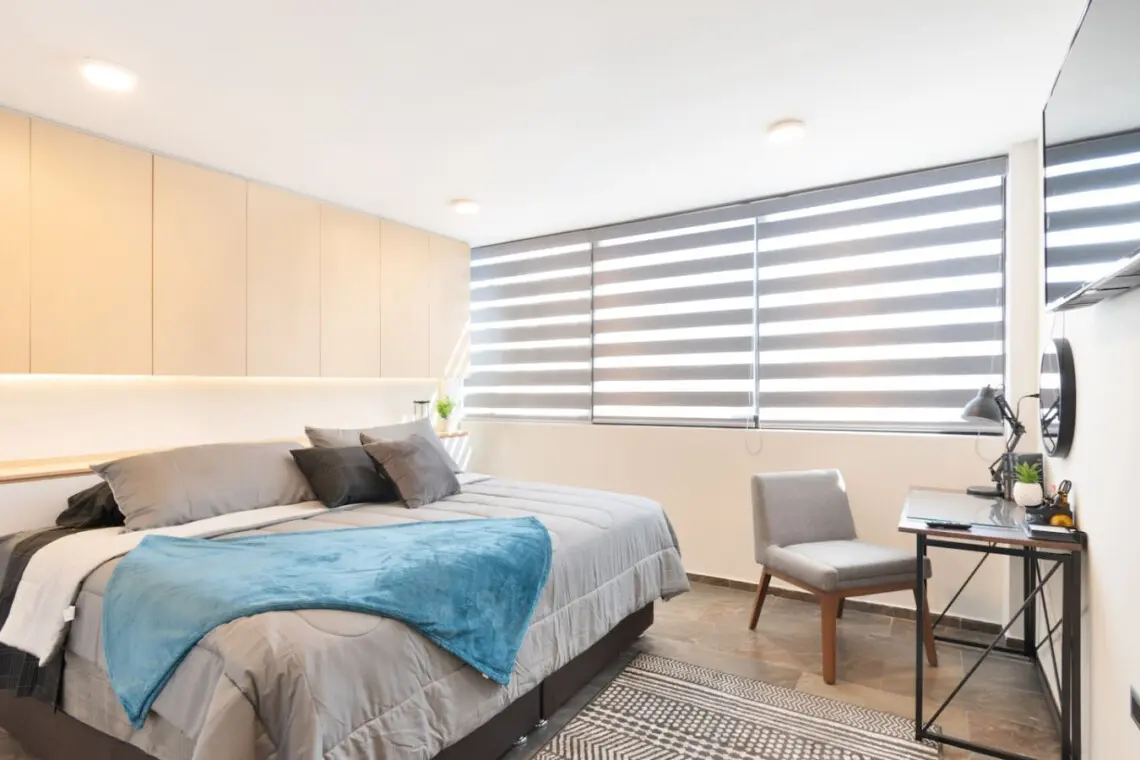 Este hermoso alojamiento cuenta con una amplia habitación con una cómoda cama King size, un generoso espacio de clóset y un práctico escritorio para trabajar o relajarte. Además, la recámara también tiene su propia pantalla para mayor comodidad.