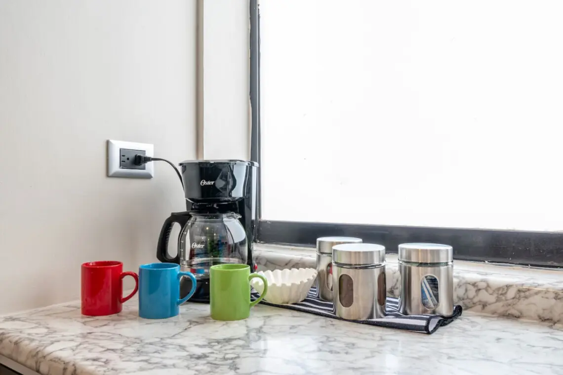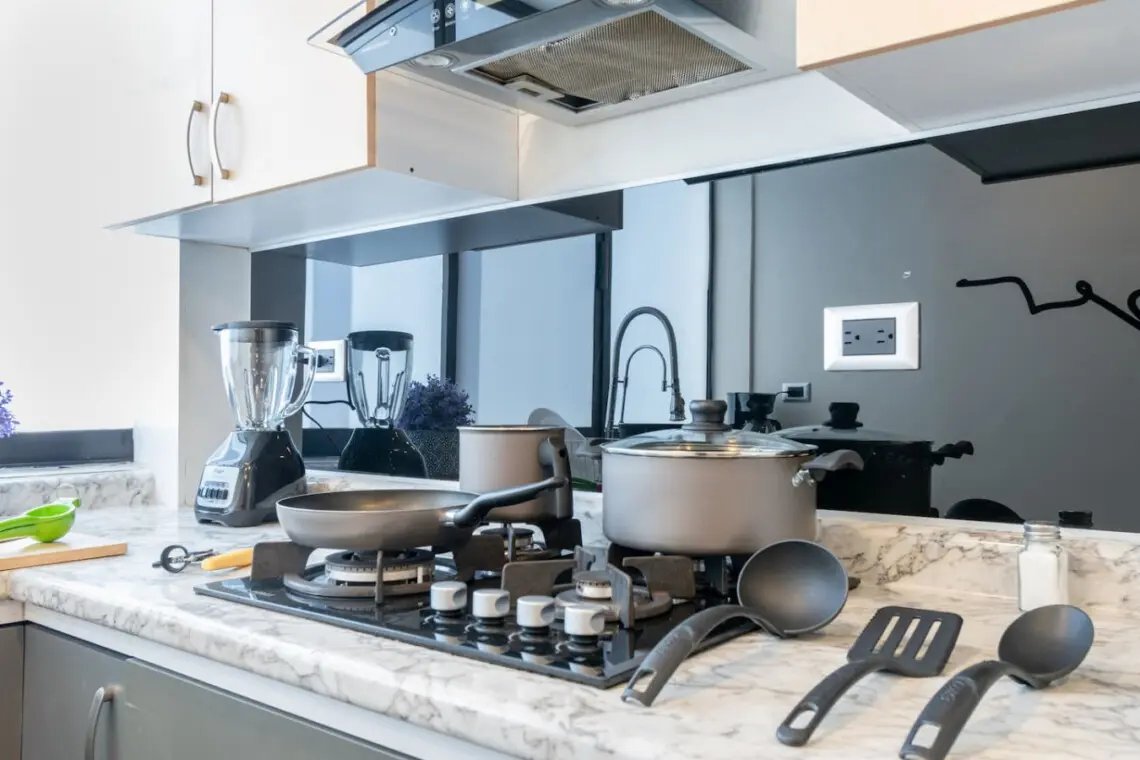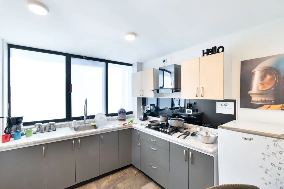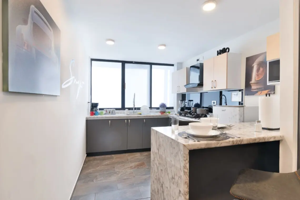 La cocina es amplia y totalmente equipada, perfecta para preparar tus platillos favoritos. Junto a ella, una mini barra con espacio para dos personas ofrece el lugar ideal para disfrutar de un café por la mañana o una copa de vino por la noche.