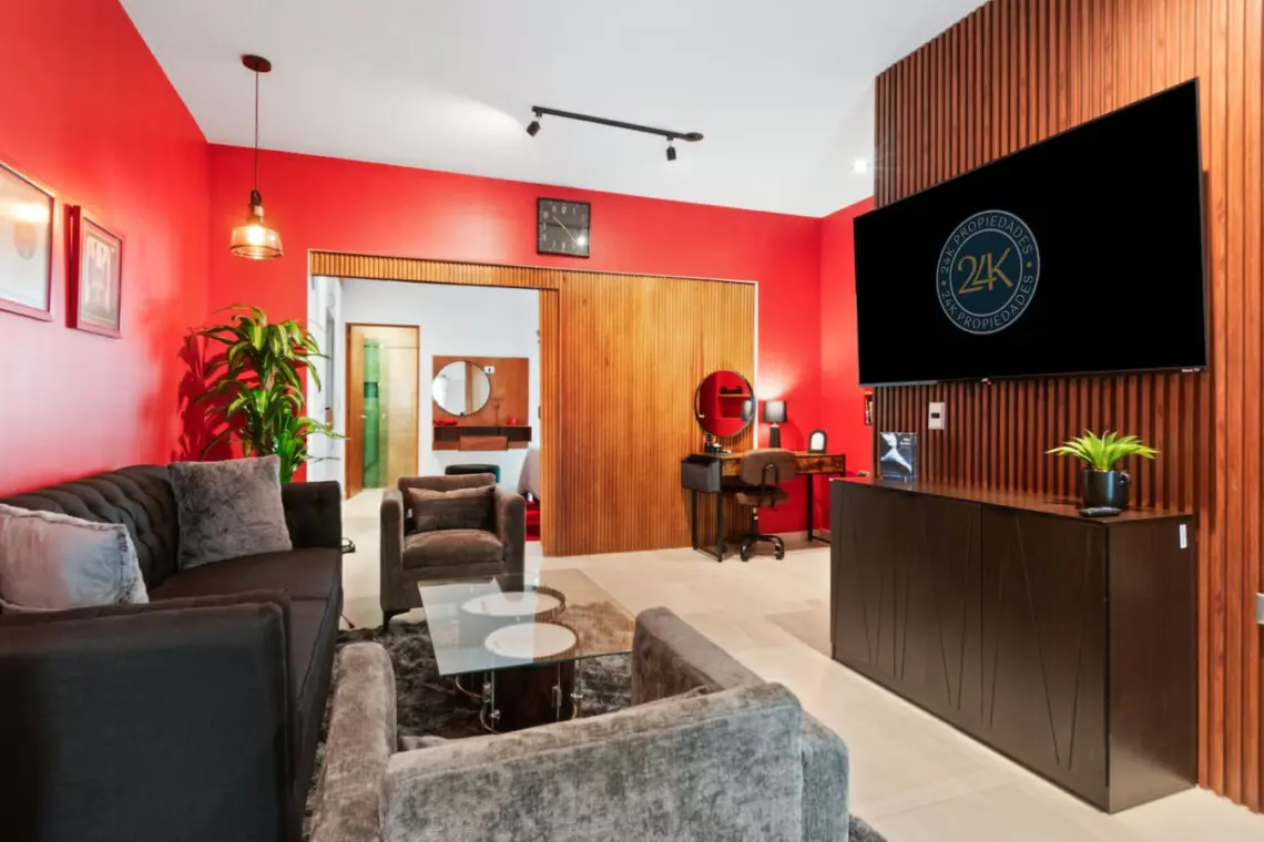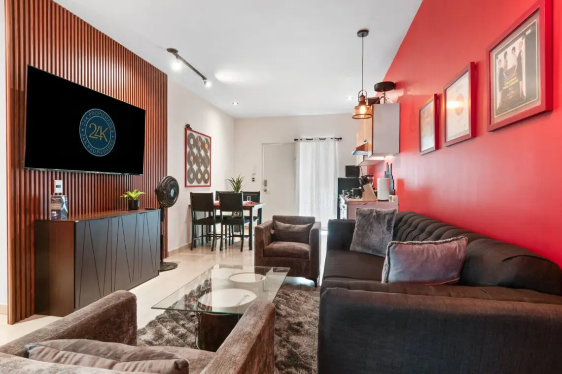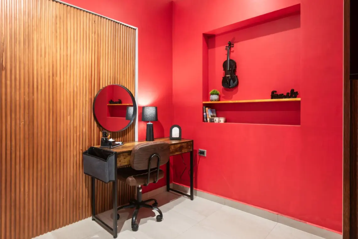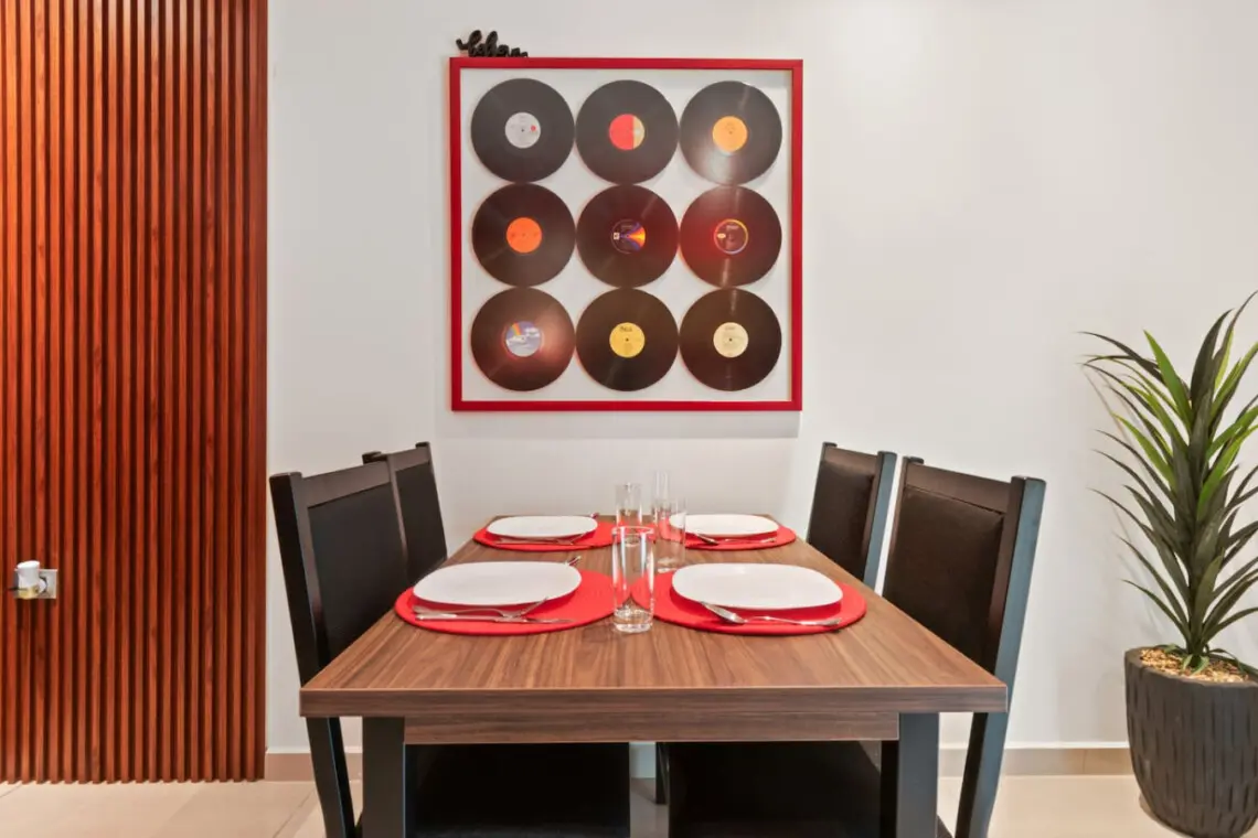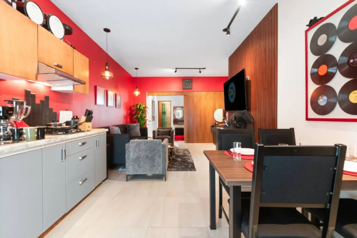 Step into a bold, music-themed apartment that blends comfort with creativity. The living room features a unique drum table with glass top, vibrant red accents, and music-inspired artwork including a 3×3 vinyl wall and iconic record paintings. Relax on the sofa while enjoying the TV, or simply soak in the artistic ambiance.