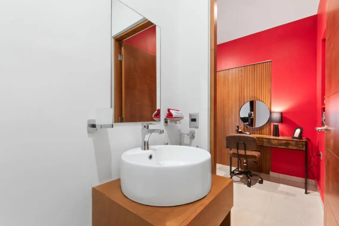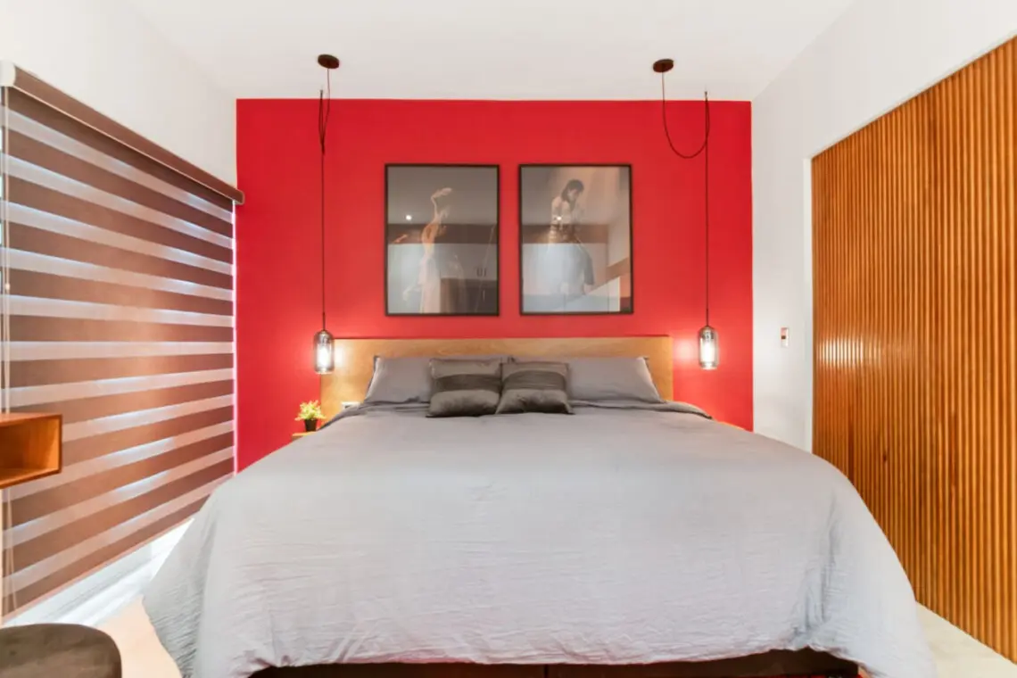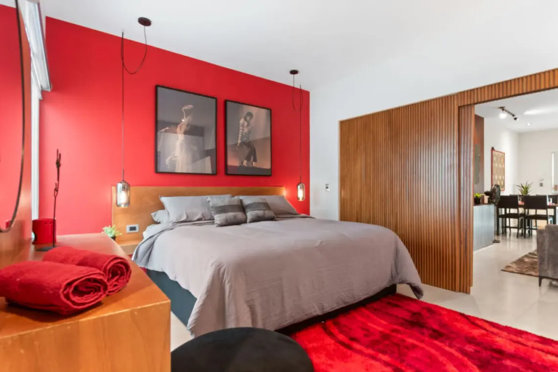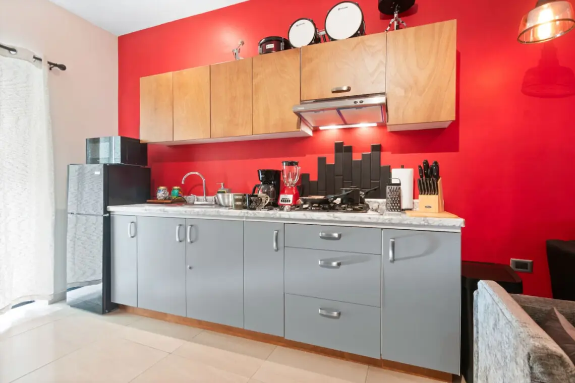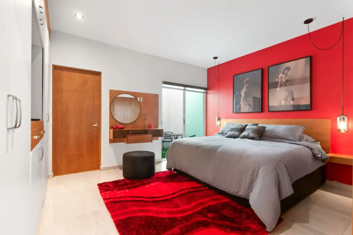 Step into a bold, music-themed apartment that blends comfort with creativity. The living room features a unique drum table with glass top, vibrant red accents, and music-inspired artwork including a 3×3 vinyl wall and iconic record paintings. Relax on the sofa while enjoying the TV, or simply soak in the artistic ambiance.
