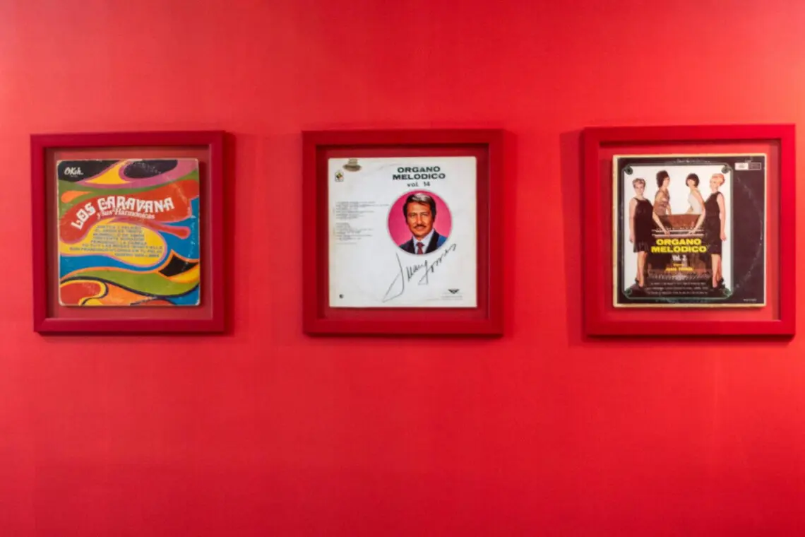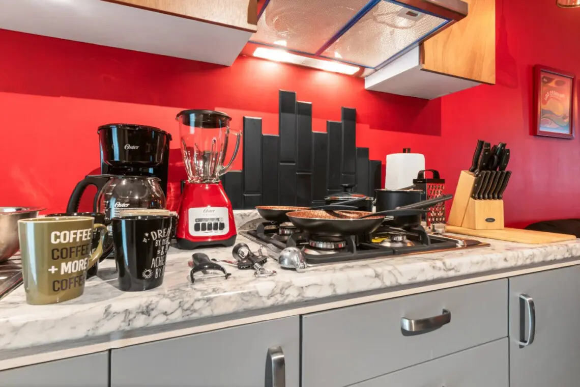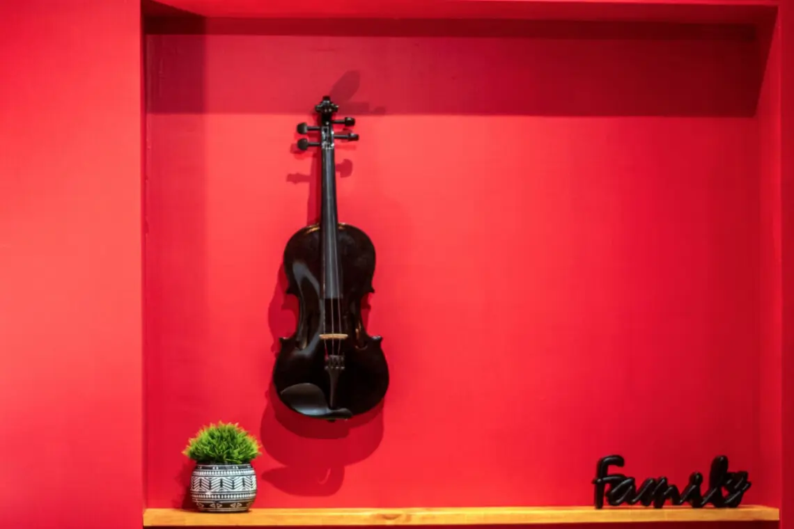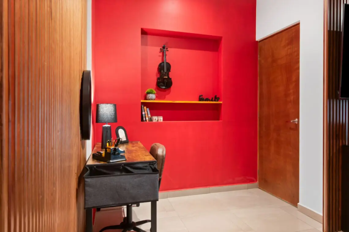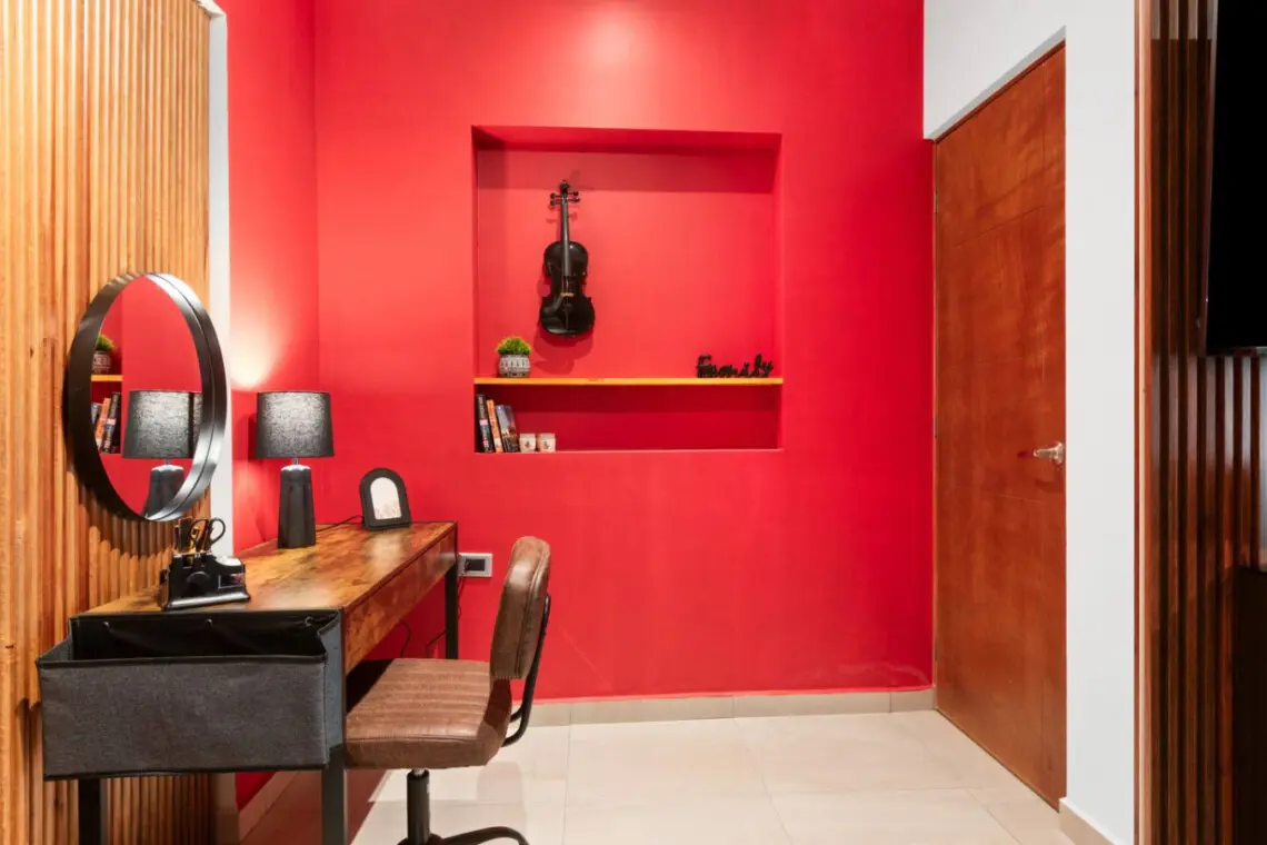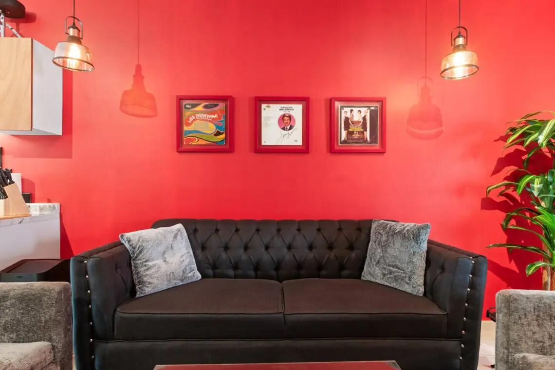 With vibrant red accents, vinyl art, and a unique drum table, it’s a space that inspires.